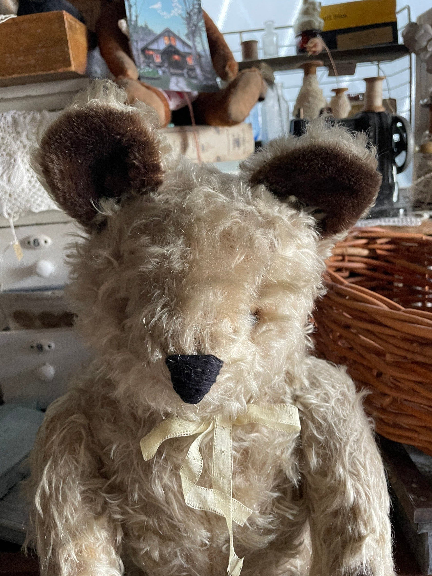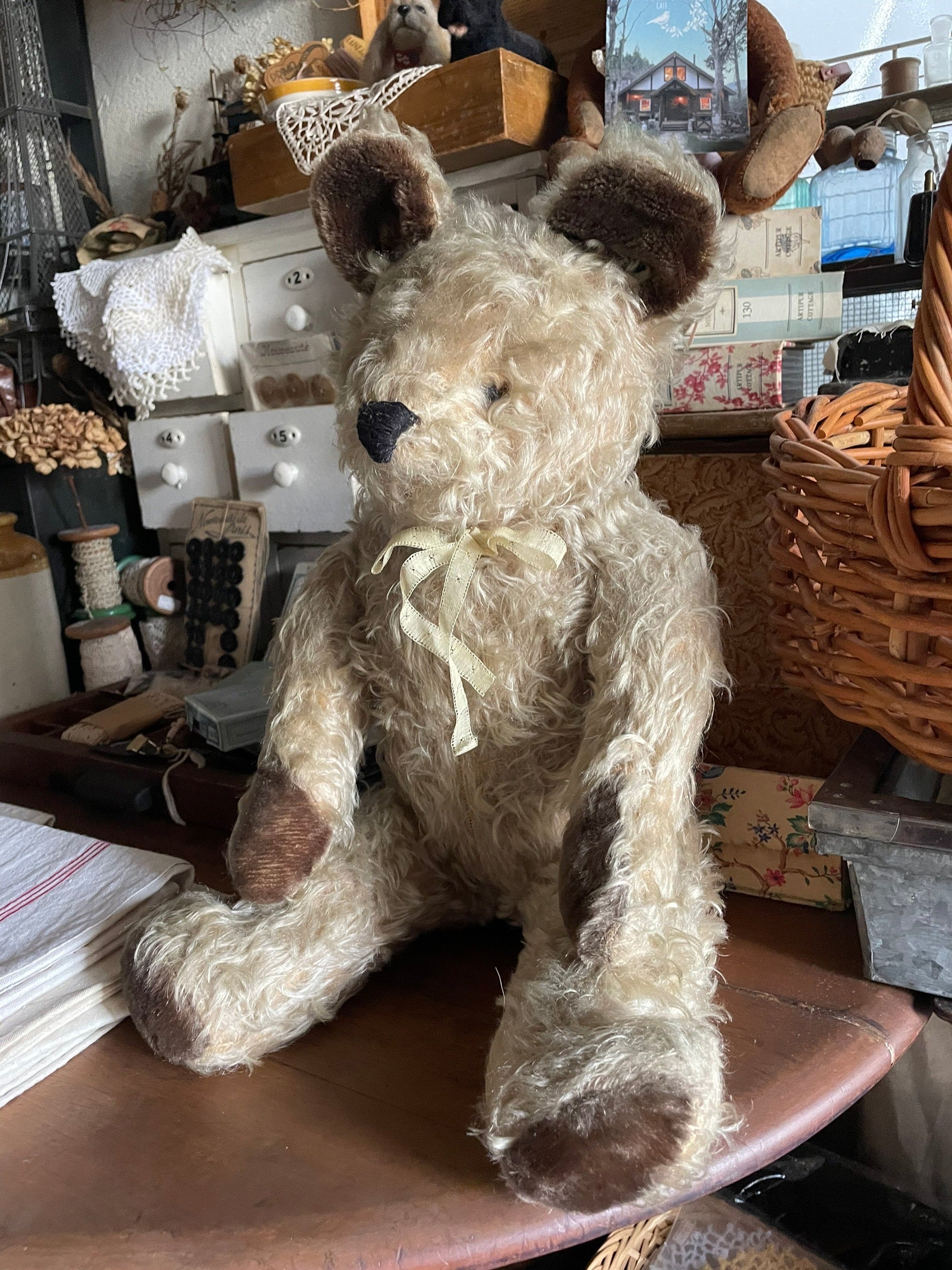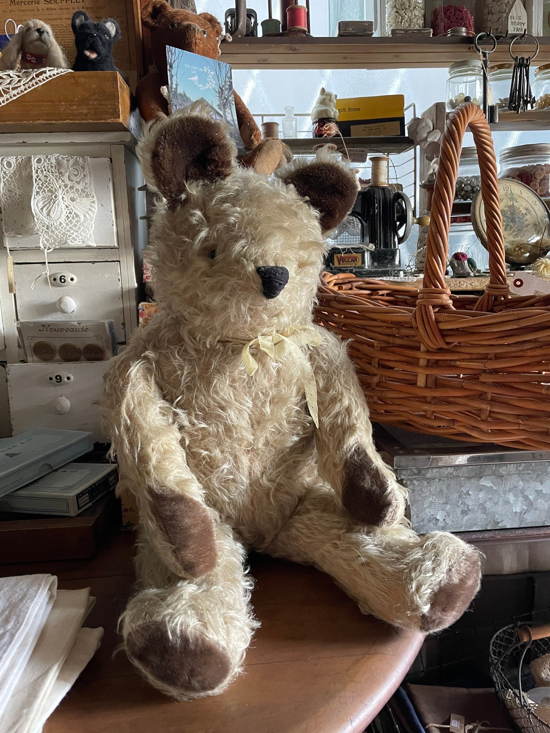 南仏で出会ったアンティークベア全長約55センチ、お座りして約40センチとても状態の良いベアちゃんです左目が欠けていますがクルクル毛並みで隠れて気になりません