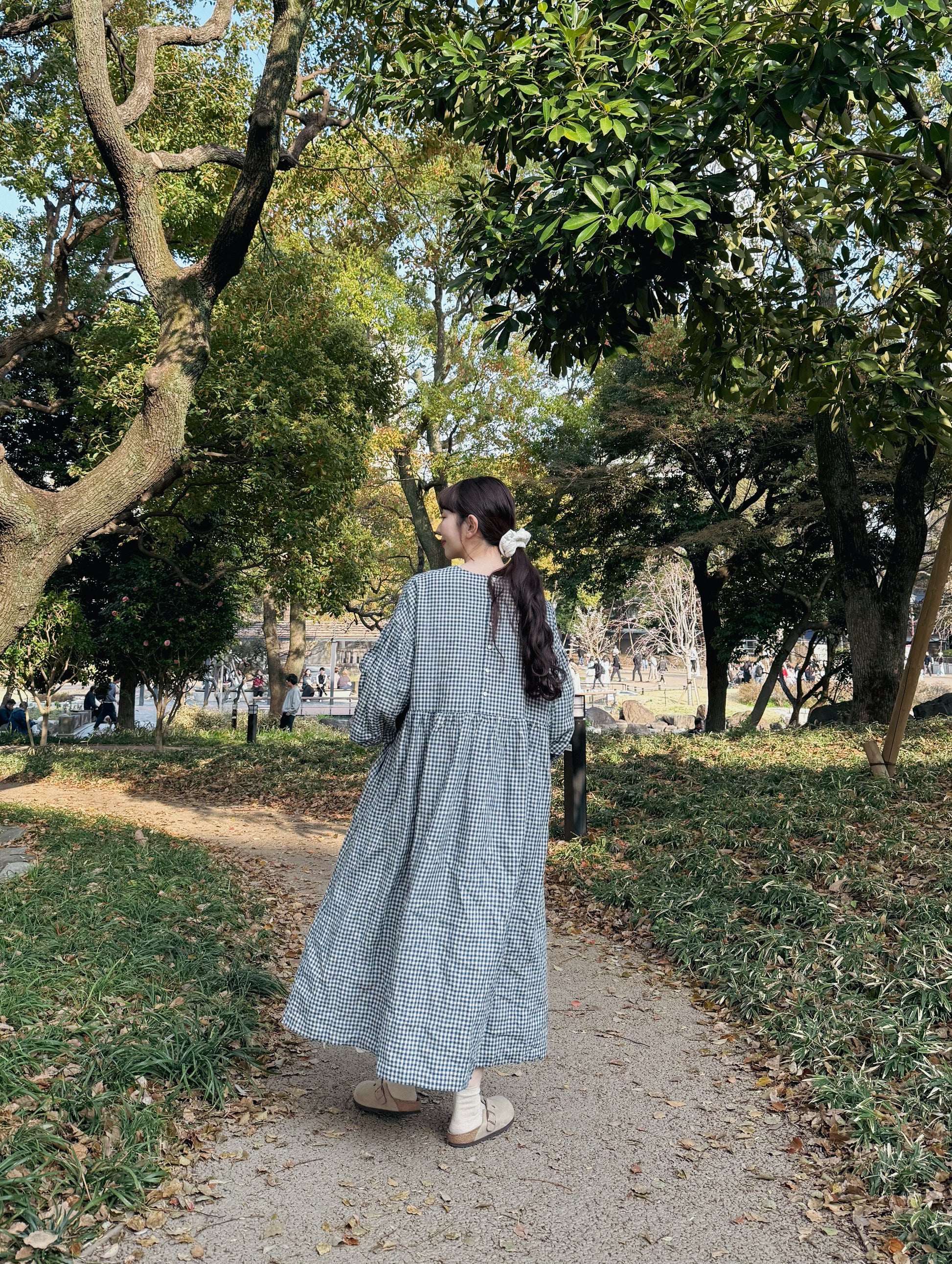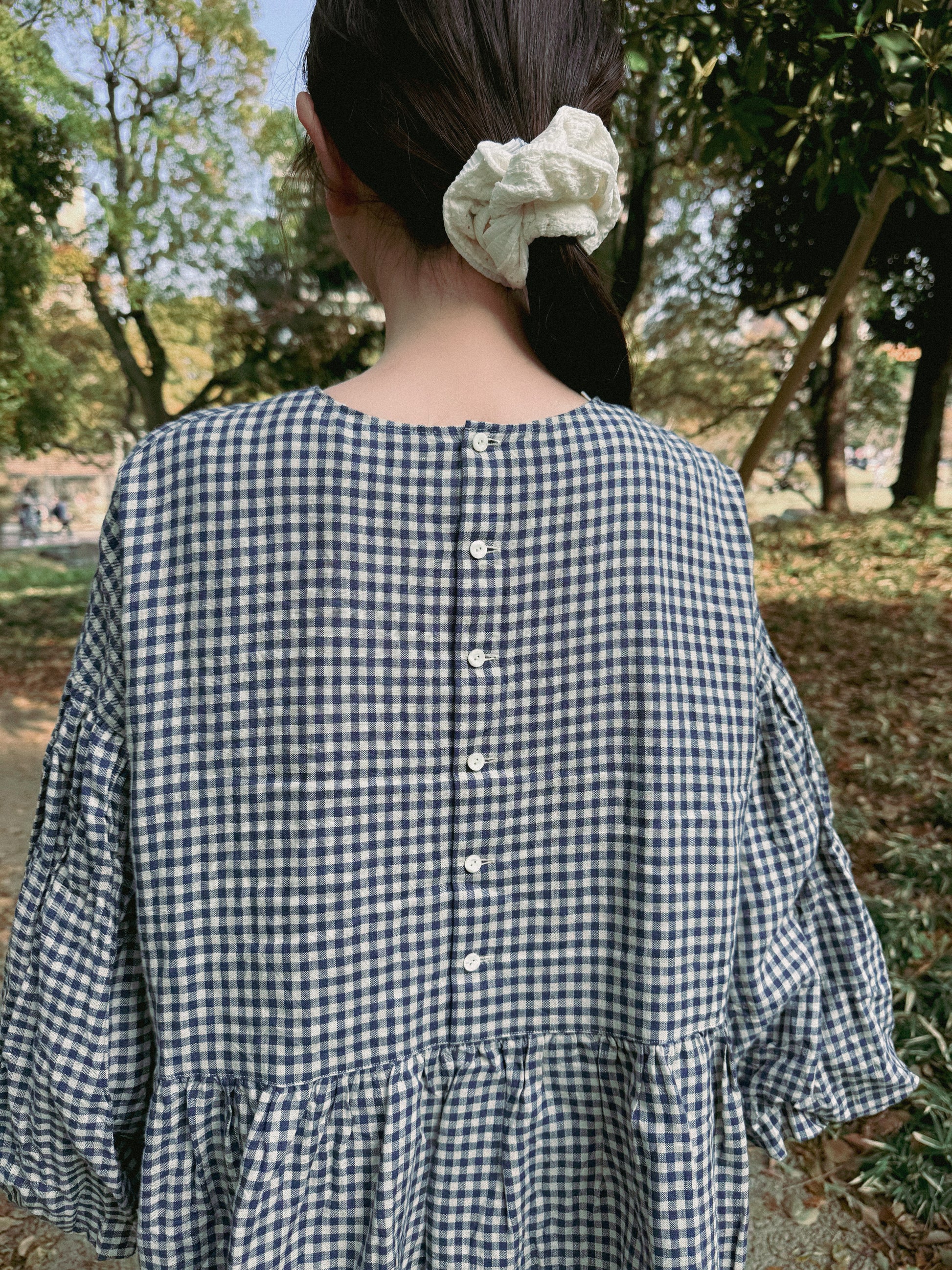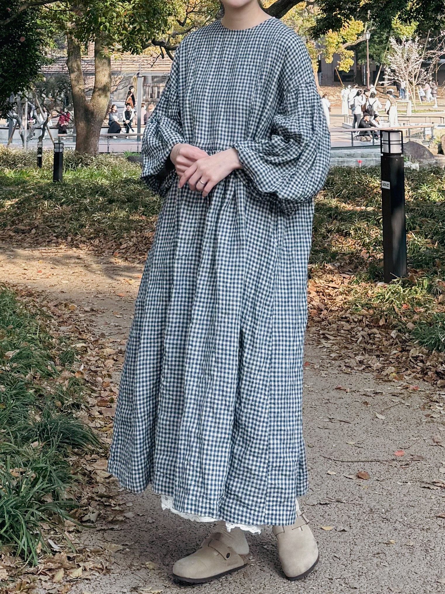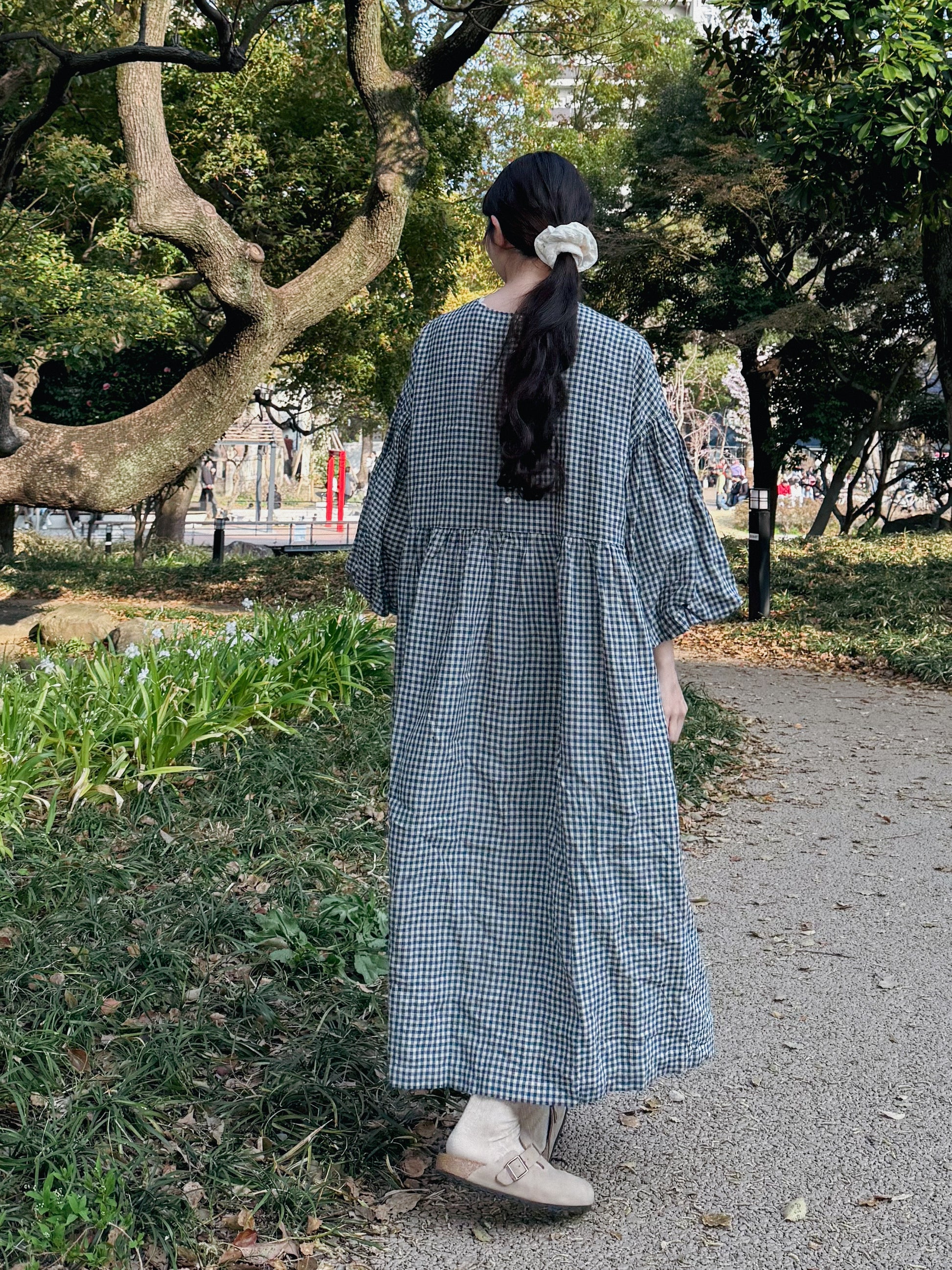 ボリュームのあるバルーンスリーブとヨーク切り替えがポイントのフレンチリネンバルーンスリーブドレス。